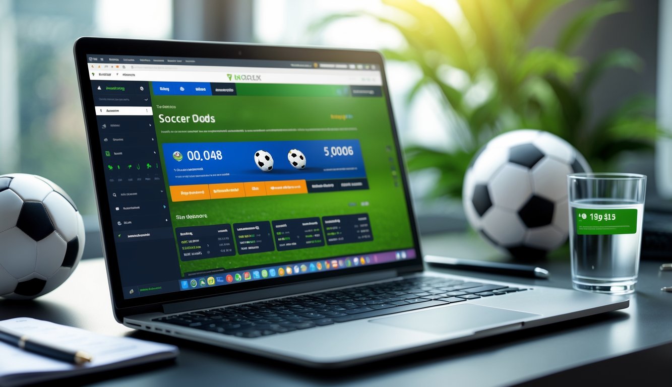 Seorang pria menggunakan laptop dan ponsel untuk memasang taruhan sepak bola di sebuah meja kerja modern.