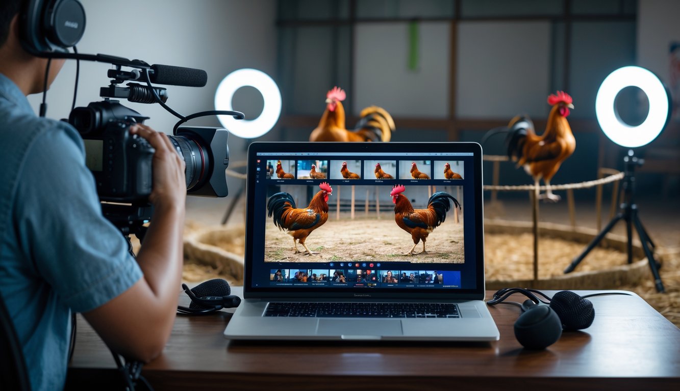 Seseorang sedang melakukan siaran langsung sabung ayam dengan peralatan streaming di dalam ruangan.