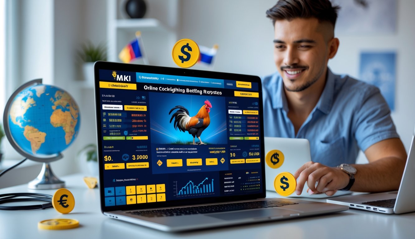 Seorang pria muda menggunakan laptop di ruang kerja modern dengan layar menampilkan situs taruhan sabung ayam internasional.